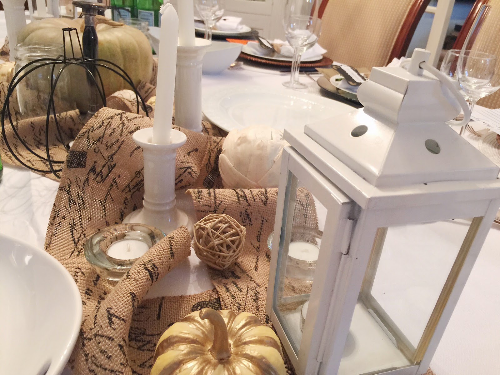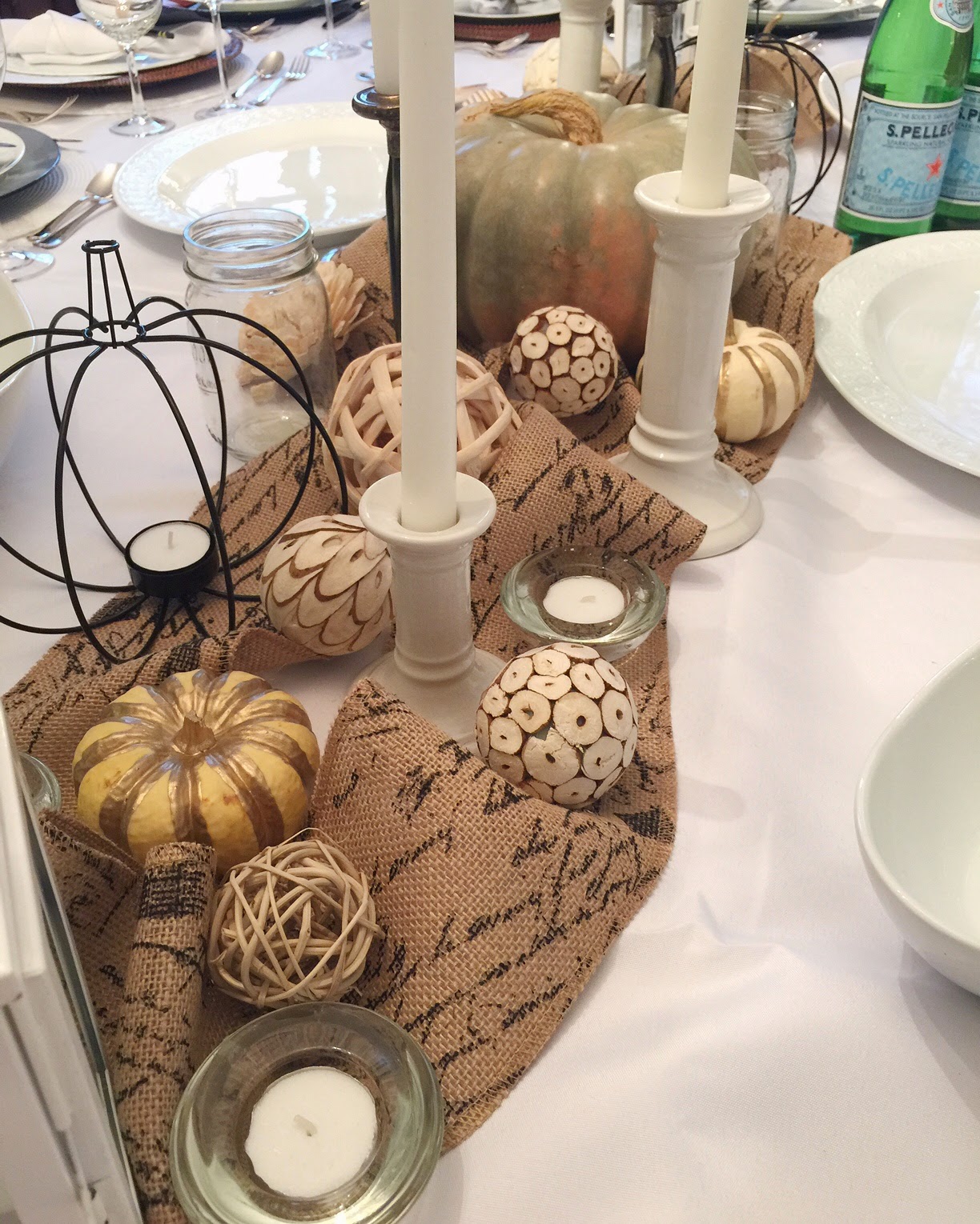 I also didn’t want to go with the typical orange and Autumn red colors. I wanted a more neutral palette. Nothing like whites, golds, creams and a little burlap to call it Thanksgiving.