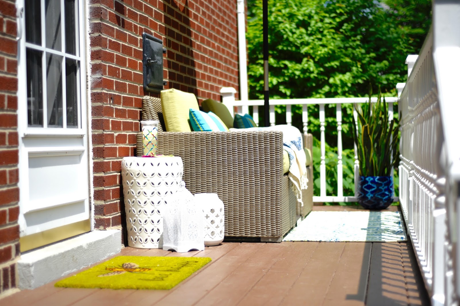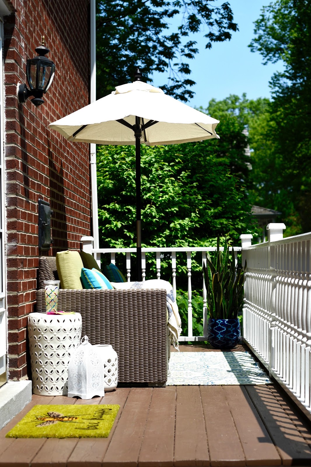 I knew that this would be a space where I could relax on a Sunday morning with my coffee or work on my laptop. With the sun directly overhead, I was in heaven to discover small umbrellas or half umbrellas to add some shade and height to the space. Also, more drum stools. I told you I was obsessing with these. Now, whoever said white isn’t a color? When styling this space I had already purchased ultra bright green cushions. I didn’t want to create a neon deck with too many bright colors, for that reason, I opted to use the white in the floor mat as my throw color in accessorizing with a cluster of floornaments. I made sure to carry the base color, blue, from all my outdoor spaces into the side deck with the floor plant, pillows and outdoor mats. This way I have unified the entire outdoor space without being all matchy matchy.