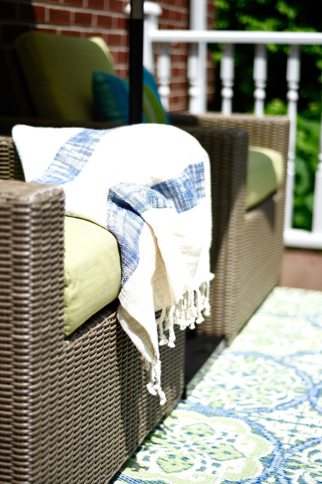 I know, I’m in love. I just love this deck so much now. I am literally writing this post sitting under the umbrella drinking lemonade. Perfection! This deck use to have just two lonely chairs and not much else. Don’t forget, when styling any space, start with the flooring. World Market makes amazing outdoor rugs that are incredibly weatherproof. You can hose them down or wipe off spills and messes.