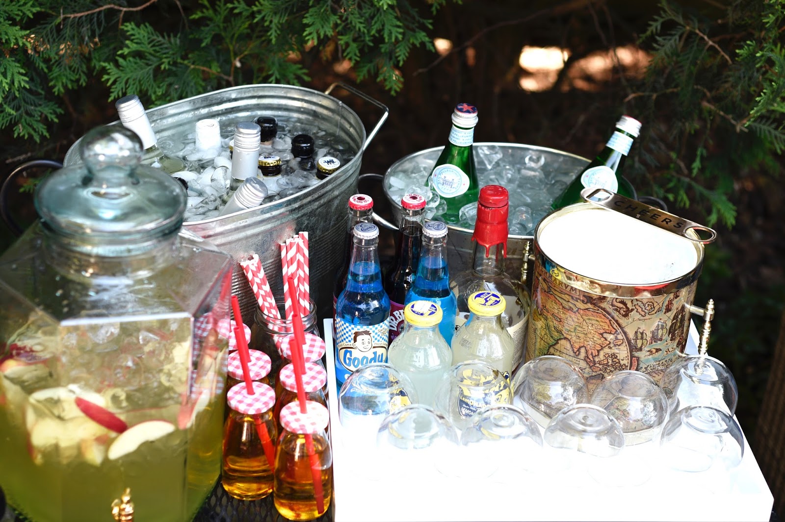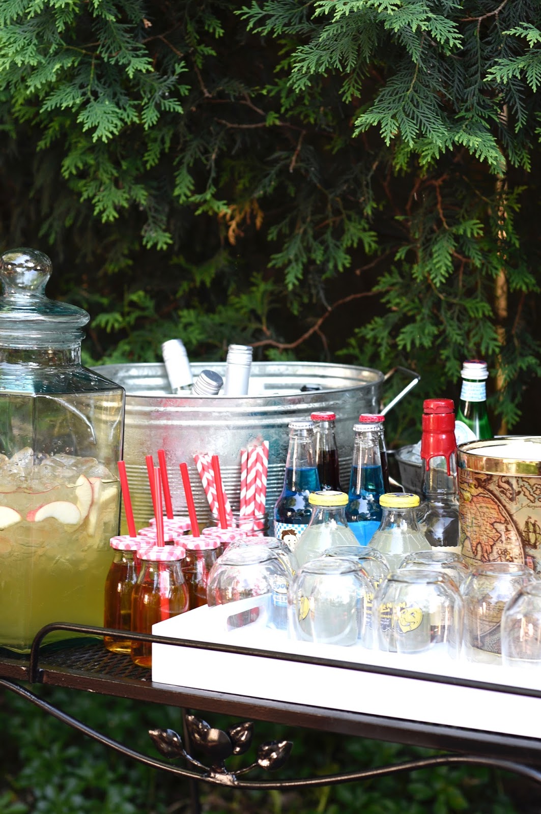 My outdoor bar cart does change for each event, depending on who is coming and what the theme is, and recently I hosted fathers day for our extended family. Which means some sangria and kid drinks for all.